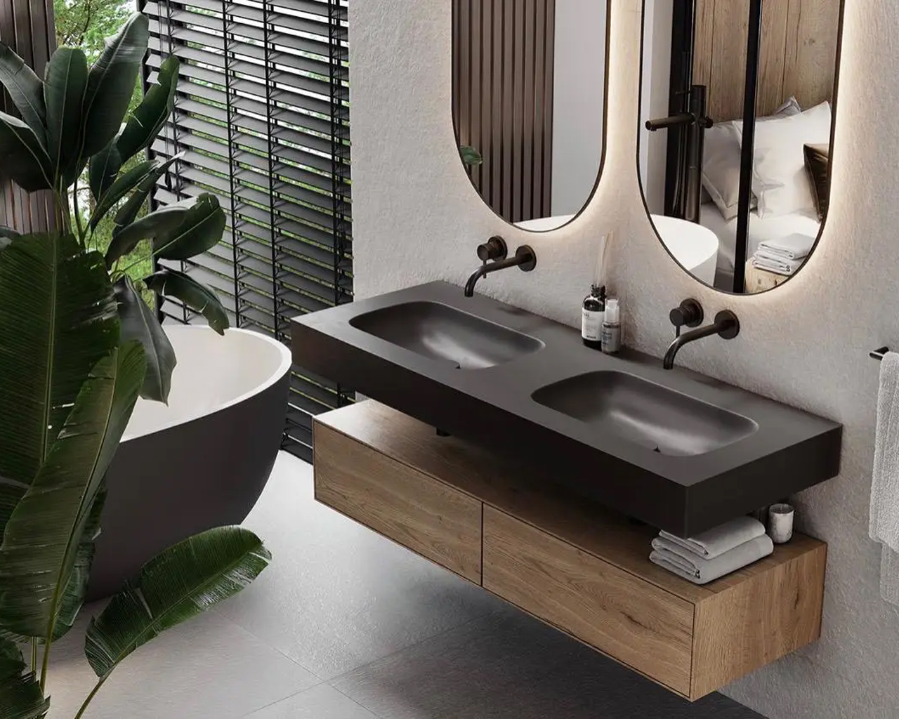 Our Corian vanities combine style and durability, offering custom designs that enhance bathrooms with elegance.